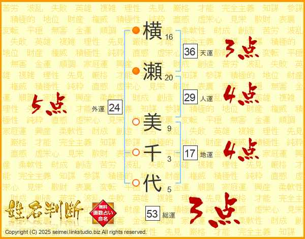 横(16画)瀬(20画) 美(9画)千(3画)代(5画)