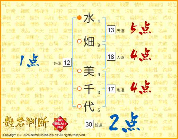 水(4画)畑(9画) 美(9画)千(3画)代(5画)