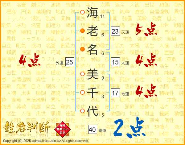 海(11画)老(6画)名(6画) 美(9画)千(3画)代(5画)