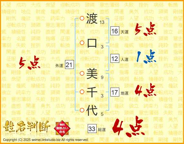 渡(13画)口(3画) 美(9画)千(3画)代(5画)