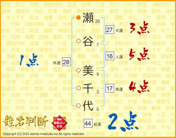 瀬(20画)谷(7画) 美(9画)千(3画)代(5画)