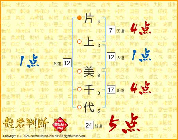 片(4画)上(3画) 美(9画)千(3画)代(5画)