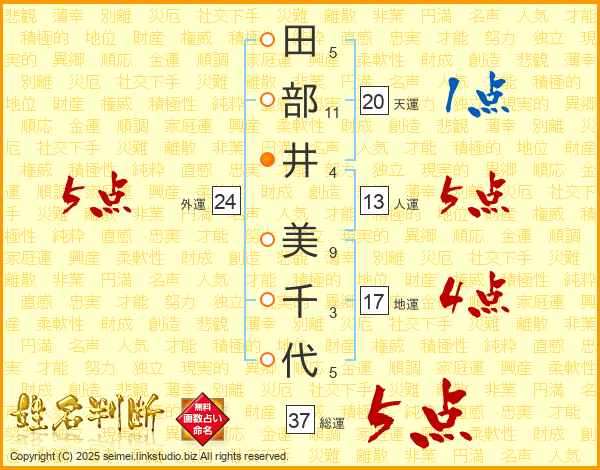 田(5画)部(11画)井(4画) 美(9画)千(3画)代(5画)