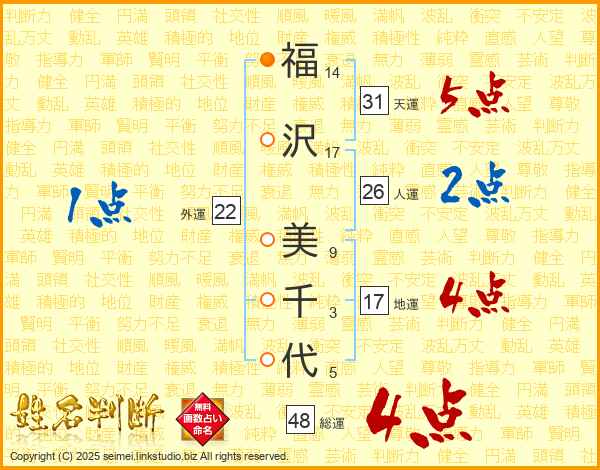 福(14画)沢(17画) 美(9画)千(3画)代(5画)