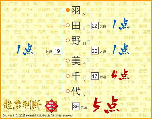 羽(6画)田(5画)野(11画) 美(9画)千(3画)代(5画)