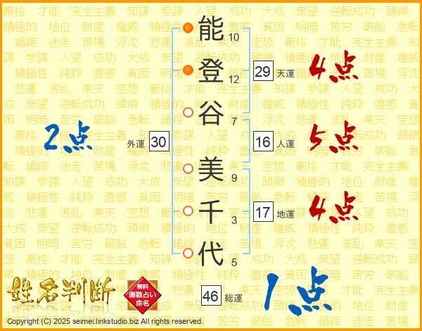 能(10画)登(12画)谷(7画) 美(9画)千(3画)代(5画)