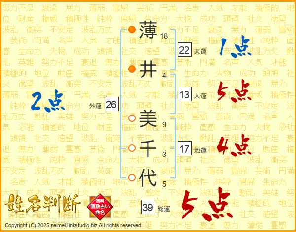 薄(18画)井(4画) 美(9画)千(3画)代(5画)