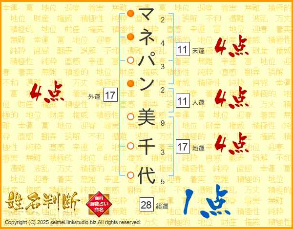 マ(2画)ネ(4画)パ(3画)ン(2画) 美(9画)千(3画)代(5画)