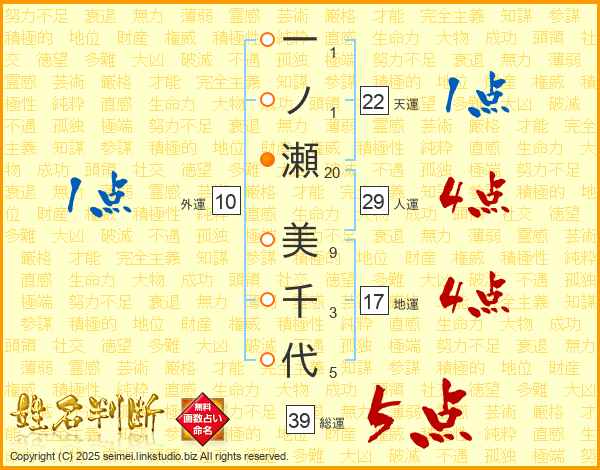 一(1画)ノ(1画)瀬(20画) 美(9画)千(3画)代(5画)