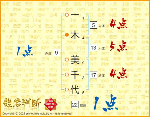 一(1画)木(4画)  美(9画)千(3画)代(5画)