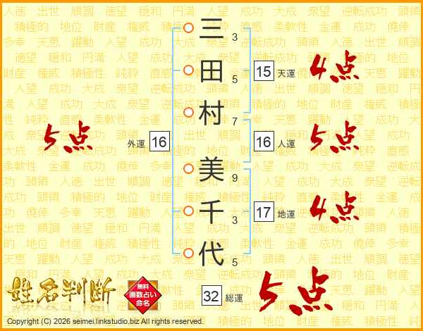 三田村美千代さんの総運は32画の5点!