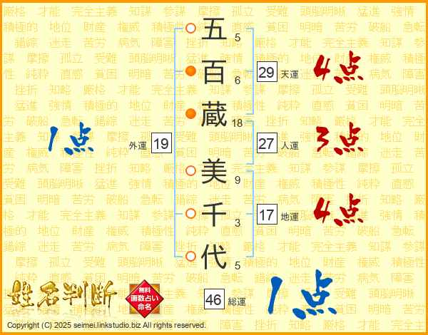 五(5画)百(6画)蔵(18画) 美(9画)千(3画)代(5画)