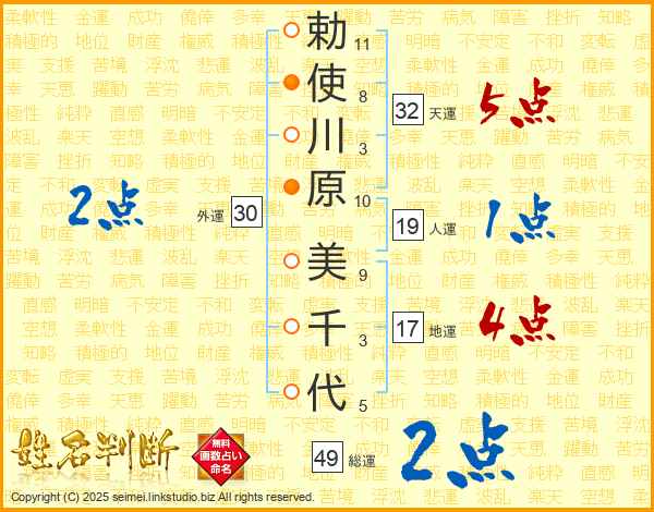 勅(11画)使(8画)川(3画)原(10画) 美(9画)千(3画)代(5画)