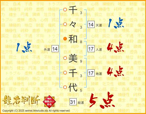 千々和美千代さんの総運は31画の5点!