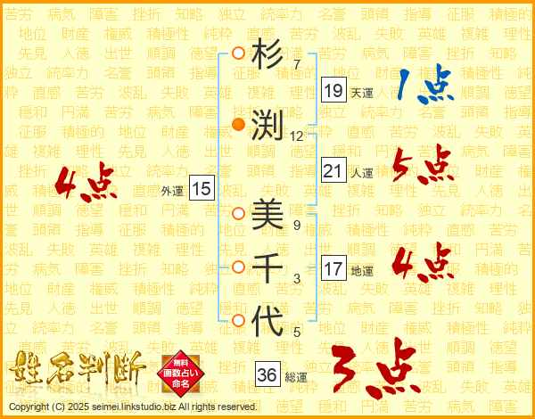 杉(7画)渕(12画) 美(9画)千(3画)代(5画)