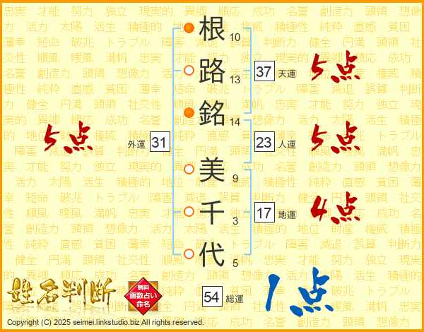 根(10画)路(13画)銘(14画)  美(9画)千(3画)代(5画)