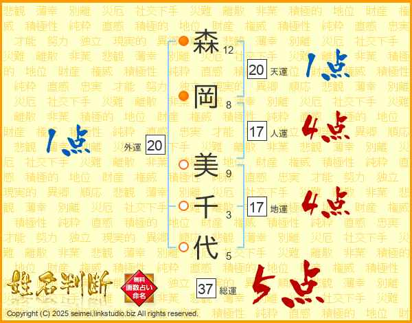 森(12画)岡(8画) 美(9画)千(3画)代(5画)