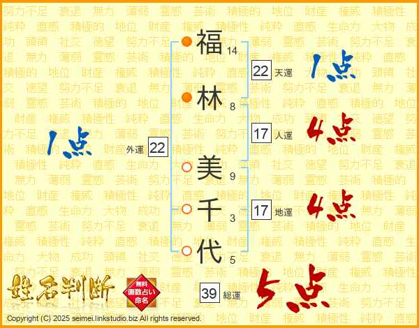 福(14画)林(8画) 美(9画)千(3画)代(5画)