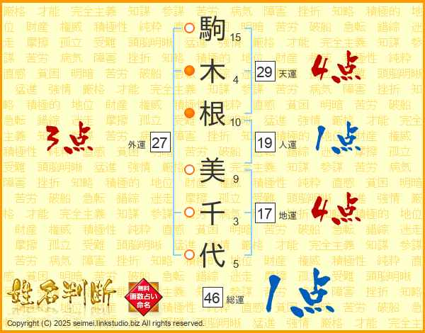 駒(15画)木(4画)根(10画)  美(9画)千(3画)代(5画)