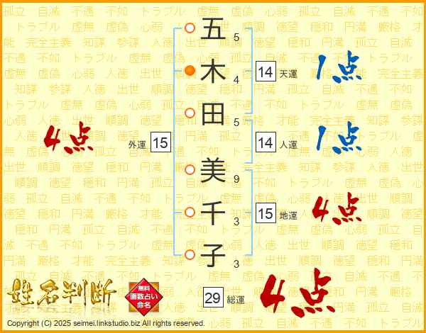 五(5画)木(4画)田(5画) 美(9画)千(3画)子(3画)