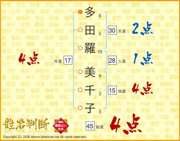多田羅美千子さんの総運は45画の4点!