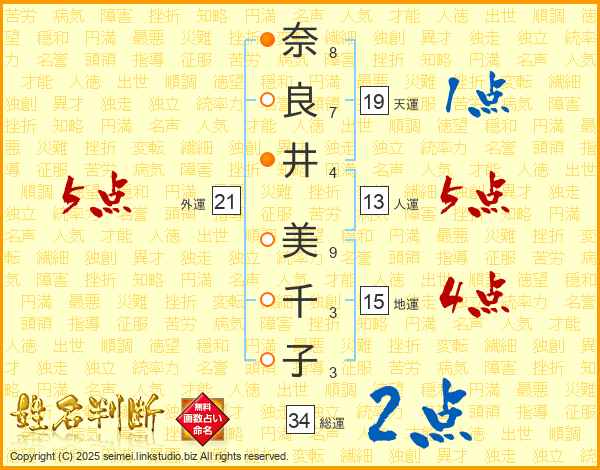 奈(8画)良(7画)井(4画) 美(9画)千(3画)子(3画)
