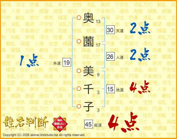 奥(13画)薗(17画) 美(9画)千(3画)子(3画)