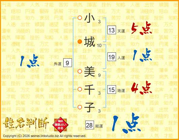 小(3画)城(10画) 美(9画)千(3画)子(3画)