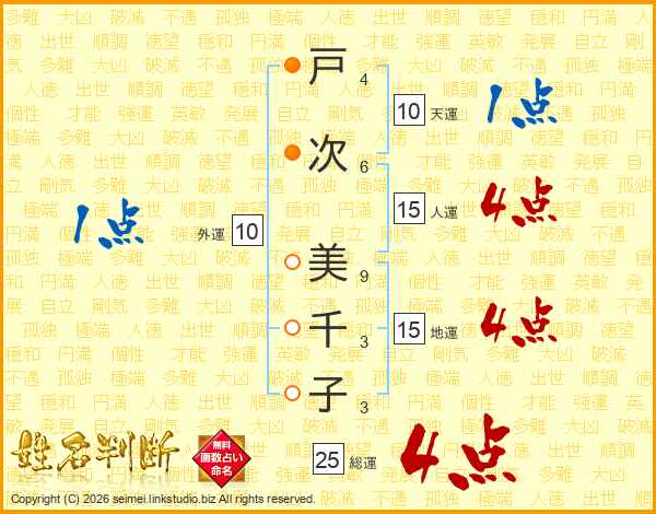 戸(4画)次(6画) 美(9画)千(3画)子(3画)
