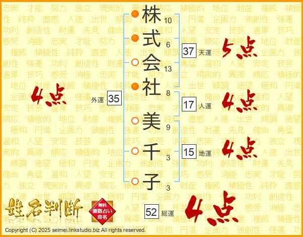 株(10画)式(6画)会(13画)社(8画)  美(9画)千(3画)子(3画)