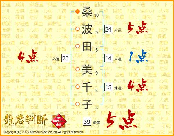 桑(10画)波(9画)田(5画) 美(9画)千(3画)子(3画)