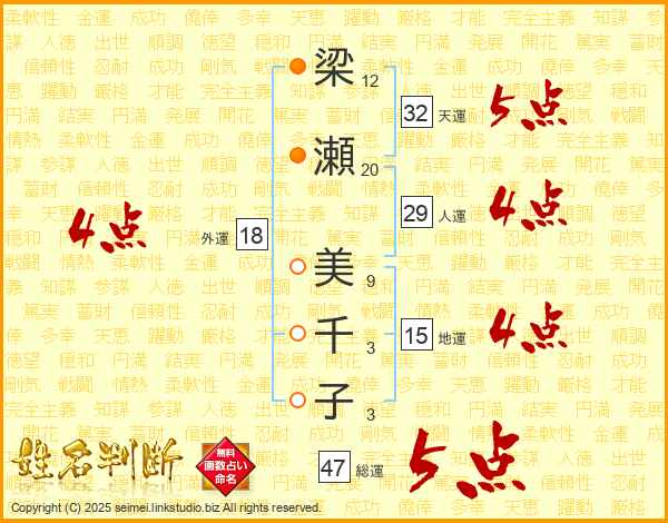 梁(12画)瀬(20画) 美(9画)千(3画)子(3画)