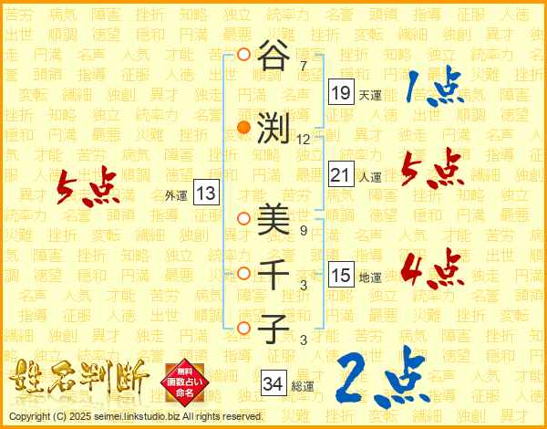 谷(7画)渕(12画) 美(9画)千(3画)子(3画)