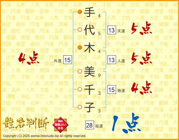 手(4画)代(5画)木(4画) 美(9画)千(3画)子(3画)