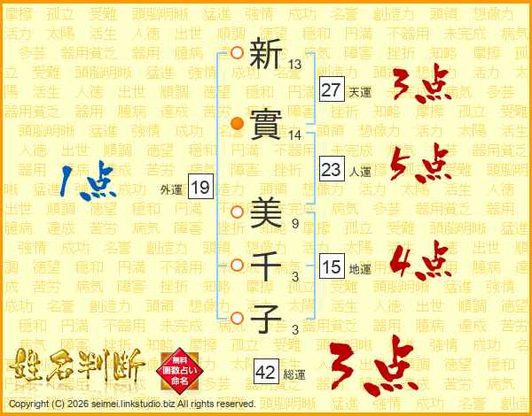 新(13画)實(14画) 美(9画)千(3画)子(3画)