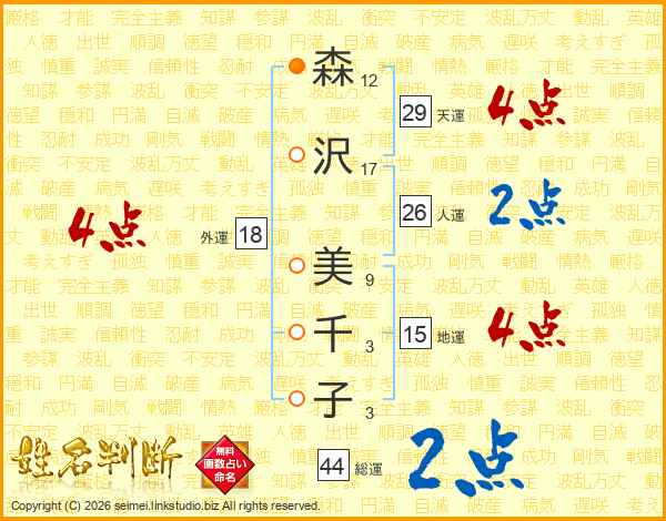 森(12画)沢(17画) 美(9画)千(3画)子(3画)