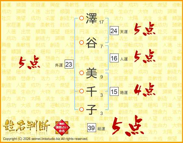 澤(17画)谷(7画) 美(9画)千(3画)子(3画)