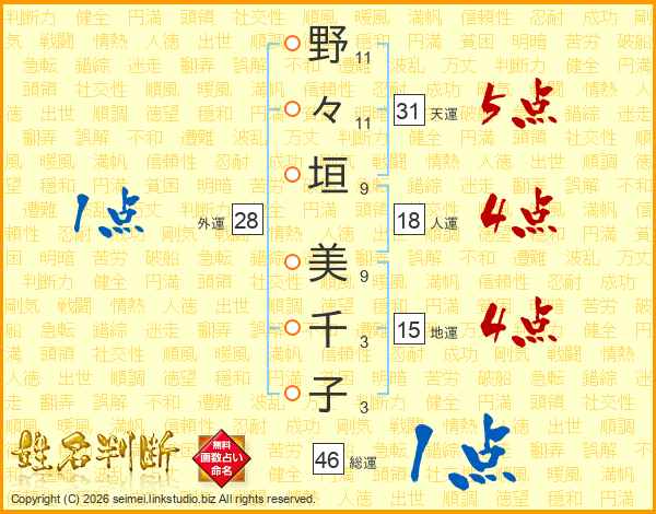 野(11画)々(11画)垣(9画) 美(9画)千(3画)子(3画)