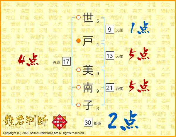 世(5画)戸(4画) 美(9画)南(9画)子(3画)