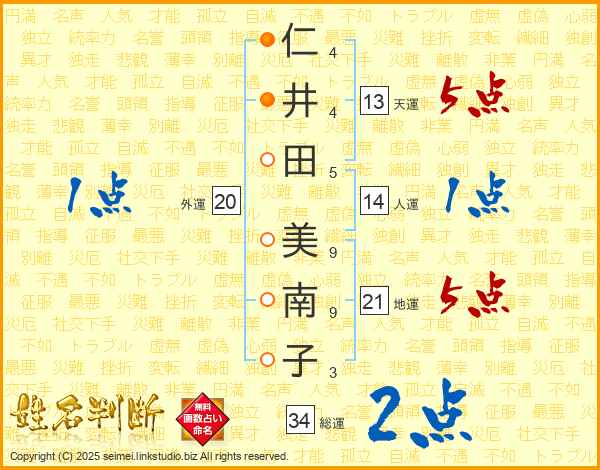 仁(4画)井(4画)田(5画) 美(9画)南(9画)子(3画)