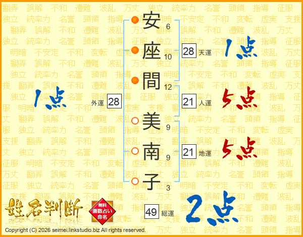 安(6画)座(10画)間(12画) 美(9画)南(9画)子(3画)