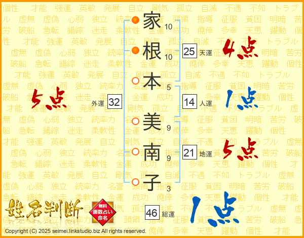 家(10画)根(10画)本(5画) 美(9画)南(9画)子(3画)
