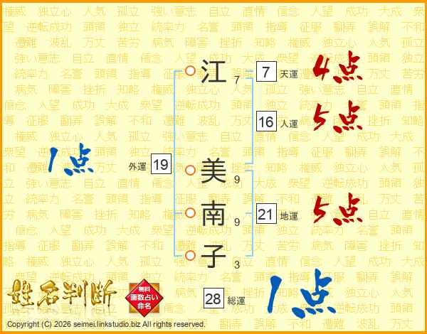 生活面を象徴する運勢です。外部から受ける影響力を表し、結婚運、家庭運や職場、環境への順応性を表します。総運から人運を引いた画数。姓や名が1文字の場合を除く。