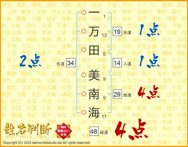 一(1画)万(13画)田(5画) 美(9画)南(9画)海(11画)
