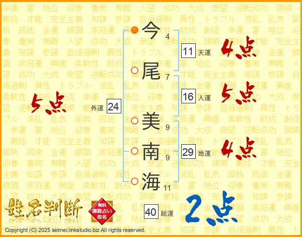 今(4画)尾(7画) 美(9画)南(9画)海(11画)