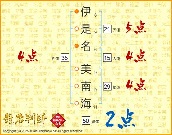 伊(6画)是(9画)名(6画) 美(9画)南(9画)海(11画)