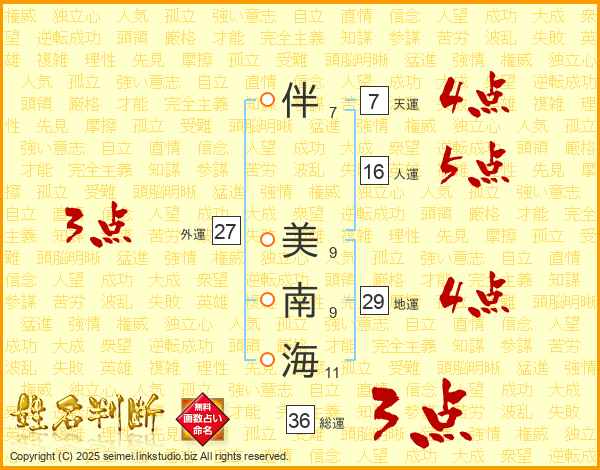 生活面を象徴する運勢です。外部から受ける影響力を表し、結婚運、家庭運や職場、環境への順応性を表します。総運から人運を引いた画数。姓や名が1文字の場合を除く。
