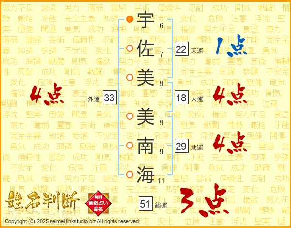 宇(6画)佐(7画)美(9画) 美(9画)南(9画)海(11画)