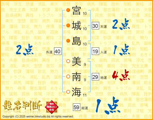 生活面を象徴する運勢です。外部から受ける影響力を表し、結婚運、家庭運や職場、環境への順応性を表します。総運から人運を引いた画数。姓や名が1文字の場合を除く。