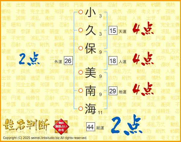 小(3画)久(3画)保(9画) 美(9画)南(9画)海(11画)